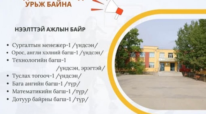Ерөнхий боловсролын сургууль нээлттэй ажлын байр зарлаж байна. ...